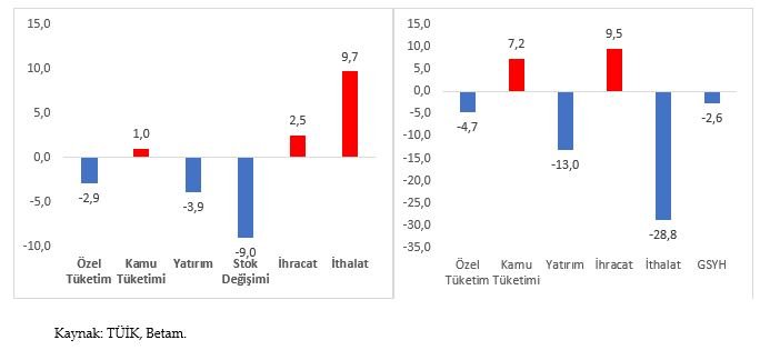2019 yılının birinci çeyreğinde Gayri Safi Yurtiçi Hasıla (GSYH) mevsim ve takvim etkilerinden arındırılmış rakamlarla bir önceki çeyreğe kıyasla yüzde 1,3 oranında artarken geçen yılın birinci çeyreğine kıyasla yüzde 2,6 küçüldü. Yıldan yıla büyümeye en büyük negatif katkı eksi 9 yüzde puan ile stok değişimi kaleminden geldi. Yatırımların büyümeye olan katkısı ise değişmeyerek eksi 3,9 yüzde puan seviyesinde kaldı. Kamu tüketiminin katkısı geçen yılın birinci çeyreğine kıyasla yüzde 1 puan arttı. Buna karşılık büyümeye olan pozitif katkı sadece net ihracat ve kamu tüketiminden geldi. İhracatın katkısı 2,5 yüzde puan olurken, ithalattaki düşüş devam ederek ithalat katkısı 9,7 yüzde puana yükseldi. Böylece 2018 yılı dördüncü çeyrekte 9,7 yüzde puan olan net ihracat katkısı 2019 yılı birinci çeyrekte 12,2 yüzde puana yükseldi.