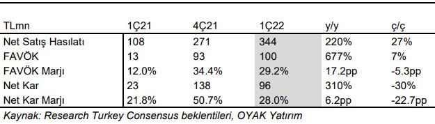Şirket, 1Ç22 sonuçlarını 96,3 milyon TL net kar ile açıkladı. Açıklanan net kar rakamı, yıllık bazda yüzde %310 artarken, çeyreksel bazda ise yüzde %30 azaldı. Net satışlar 344 milyon TL olarak açıklandı ve geçen senenin aynı dönemine göre yüzde %220 arttı. Şirket, 1Ç22’de 100 milyon TL FAVÖK açıkladı ve bu rakam geçen senenin aynı dönemine göre yüzde %677 artış gösterdi. FAVÖK marjı ise, geçtiğimiz yılın aynı dönemine göre 1716 baz puan artarak %29 oldu.